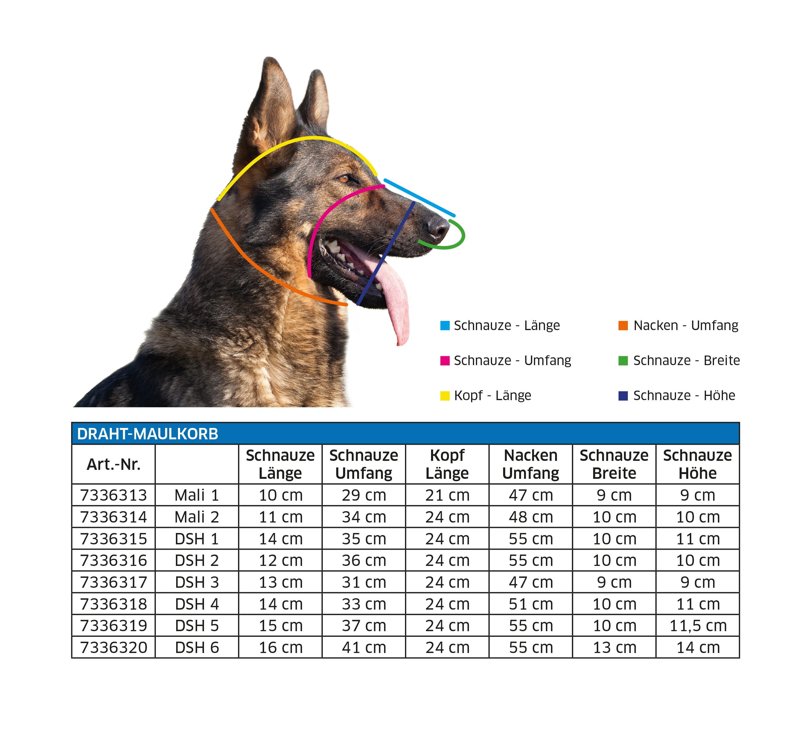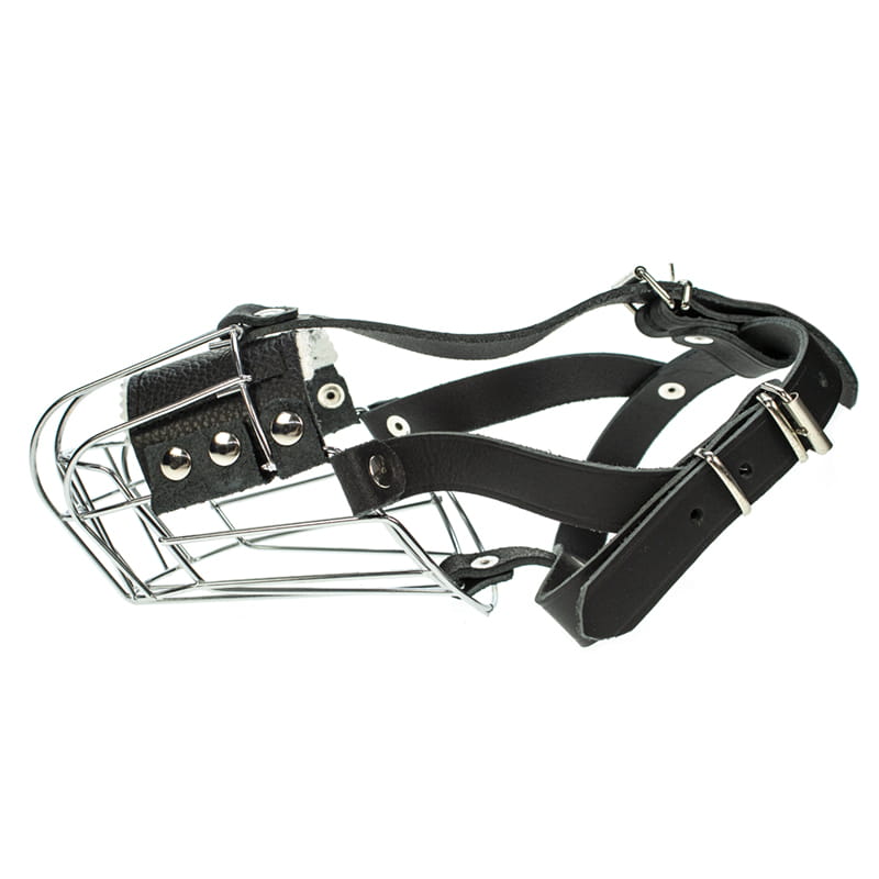 Stabiler Maulkorb bestehend aus einem Drahtkorb mit vernieteten Lederriemen. Ein zusätzlicher Riemen, der die Stirn hoch verläuft und sich in den zweiten Riemen einfädeln lässt, sorgt dafür, dass der Hund den Maulkorb nicht so einfach abstreifen kann. Am oberen Teil ist der Korb mit einer leichten Polsterung unterlegt, die das Wundreiben vermeidet.