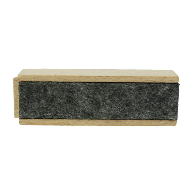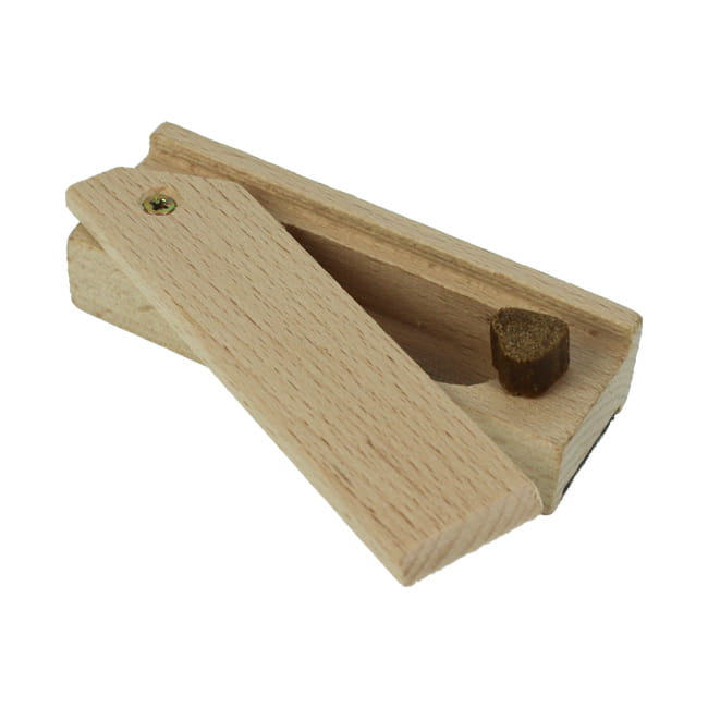 Holz-Box mit eingeklebtem Filz-Gegenstand und über eine Klappe zu öffnendes Reservoir. Darin bewahrst du das Leckerchen für die erfolgreiche Anzeige auf und kannst deinen Hund dann direkt aus dem Gegenstand heraus bestätigen.