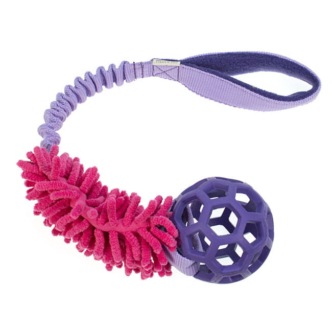 Das ultimative Bestätigungsspielzeug, bestehend aus einem JW Hollee Ball in Gr. S und einem Mopp, die an einem Bungee-Seil befestigt sind.
