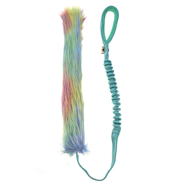 Regenbogenfarbenes Bestätigungsspielzeug bestehend aus einem am Bungee-Seil befestigten Fellteil.
