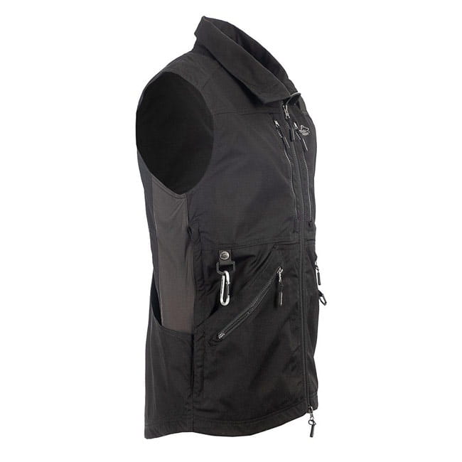 Die Weste ist grundimprägniert, kann aber mehrmals nach imprägniert werden, um besser gegen Nässe zu schützen. Belüftungsreißverschlüsse an den Seiten. Zwei große Brusttaschen und im unteren Bereich Doppeltaschen, eine mit Reißverschlüssen und eine offene Tasche. Am Ende des Rückenbereichs eine große Rückentasche. Auf der Innenseite der Weste befinden sich zwei große Innentaschen. Verstellbarer Kordelzug am Saum der Weste. Eine elastische äußere Halterung vorne an der rechten Schulter sowie unter dem Achselbereich. Die Platzierung der elastischen Halterung eignet sich perfekt, um ihr Belohnungsspielzeug festzuhalten.