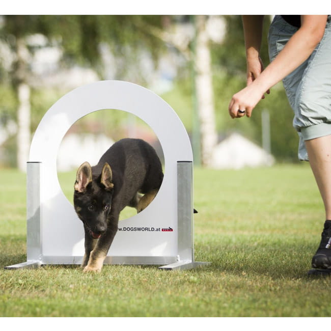 Der Welpenreifen der Firma Dogsworld wird aus einem stabilern Alurahmen gefertigt. Er ist ein leichtes und doch für kleine Welpen sehr herausforderndes Objekt, dass jede Welpenstunde zur Mutprobe macht.