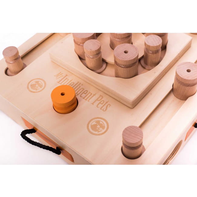 Das Geschicklichkeitsspiel besteht aus zertifiziertem Holz, das mit einer Schicht durchsichtigen und für Mensch und Tier unschädlichen Wasserlack überzogen wurde. Bitte schütze das Spiel vor Feuchtigkeit, da es sonst aufquellen kann. Verwende zum Spielen nur trockene Hundesnacks.