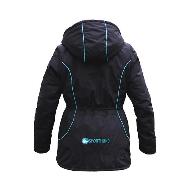 Taillierter Schnitt für Damen. Innen ist die Jacke weitenregulierbar und gefüttert mit gestepptem Polyester. Sie hat eine verstellbare Kapuze und die Ärmel innen einen Pullover-Bund. Eine Innentasche mit Klettverschluss ist vorhanden, die groß genug für das Smartphone ist. Am Rücken befindet sich eine geräumige Hasentasche. Vorne gibt es zwei Einschubtaschen und darauf aufgesetzt noch zwei Taschen mit Druckknopfverschluss. Eine Seite hat zusätzlich eine abnehmbare Futtertasche. Großer Sporthund Logo-Stick in weiß-blau hinten am unteren Bund und in kleinerer Version vorne auf einer Tasche.