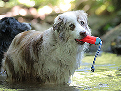 Pia Schmalzbauer: „Den Kong kennt man halt seit Jahren. Die schwimmfähige Version ist für Kong-gewöhnte Hunde sicher toll, aber der Spaßfaktor liegt eher bei den anderen getesteten Wasserspielzeugen. Auch ist das Seil etwas zu lang. Da tut man sich mit dem genauen Werfen noch schwerer.“
