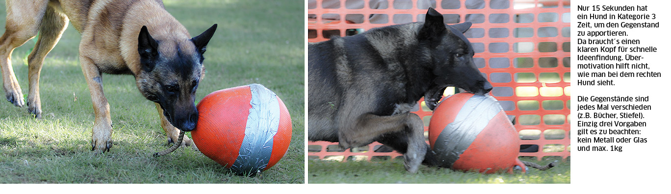 sind unvergleichlich mit anderen Hundesportarten. Die Reihenfolge der Teilübungen innerhalb der Disziplinen ist jedes Mal anders, wird jeweils vom Leistungsrichter bestimmt. Außerdem sind die Übungsaufbauten absolut der Kreativität des ausrichtenden Vereins überlassen. Das bedeutet, der Hund wird jedes Mal erneut mit Unbekanntem konfrontiert. Das verlangt Flexibilität. Der Hund braucht Ideen, wenn der Gegenstand, den er zu apportieren hat, schlecht greifbar ist oder der Helfer mit komischem Zeugs in der Abwehr steht. Übungen, wie das beschriebene Gegenstandsbewachen oder die Hundeführerverteidigung, in der sogar gleich zwei Helfer gleichzeitig permanent provozieren, zeigen, was der Hund zu leisten hat. In letztgenannter Übung muss er sich neutral verhalten und darf erst beißen, wenn einer der beiden Helfer mit beiden Händen an den Hundeführer geht. Schwierige und stressige Übung, wenn man bedenkt, dass eine Hand am Hundeführer zu nichts führen darf und trotzdem vier Hände zu beobachten sind. Und als wäre das nicht schon komplex genug, dürfen zur Provokation auch noch Drittpersonen vom Helfer „angegriffen“ werden oder untereinander streiten und so für Aufregung sorgen. Nur beim Angriff hat der Hund sofort zu packen und bis zum Aus-Kommando mit dem Homme d´Attaque zu “kämpfen“. Danach muss er fünf Sekunden bewachen und wird dann vom Hundeführer zurückgerufen. Sämtliche Kommandos oder Hilfen sind bis zum Abruf nicht erlaubt. Der Hund ist auf sich gestellt.