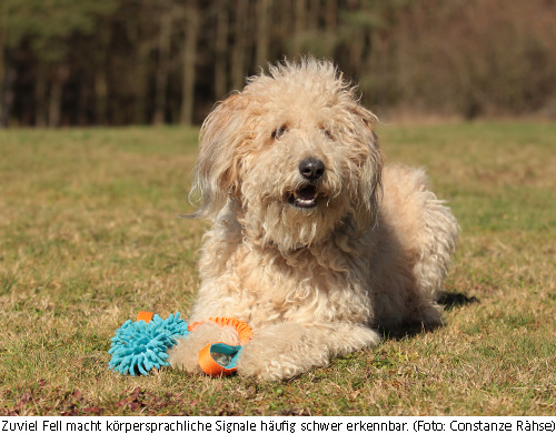 Ein Hund mit extrem langem Fell und „Gardine“ vor den Augen macht die Erfahrung, dass weder andere Hunde, noch Menschen auf feine Kommunikation reagieren. Kein Fell kann gesträubt werden, Muskelanspannung und die Stellung der einzelnen Gliedmaßen verschwinden unter dem langen Gewand.