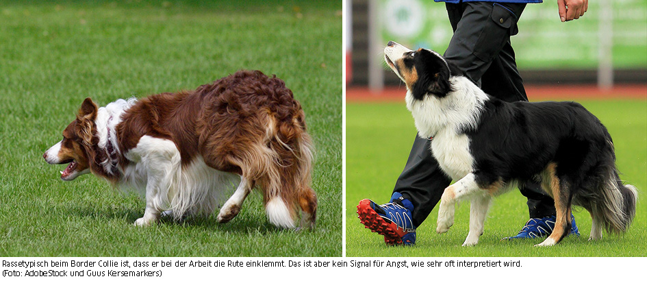 Wer Border Collies bei ihrer Arbeit an den Schafen erlebt, sieht nicht nur einen schleichenden Gang und einen fixierenden Blick. Auffällig ist, dass die Rute bei der Arbeit eingeklemmt wird. Eine eingeklemmte Rute ist für viele Hundehalter das Signal, dass der Hund ängstlich ist. Allerdings gibt es selektionsbedingte Änderungen des Aussehens der Hunde. Bei einem Border Collie bedeutet eine eingezogene Rute nicht zwangsläufig, dass der Hund Angst hat. Die Rute wird auch bei starker Anspannung, wie zum Beispiel bei der Jagd (das Hüteverhalten der Border Collies ist ein züchterisch beeinflusstes Jagdverhalten) eingezogen. Auch hier muss der Kontext und der Rest der Körpersprache beachtet werden, um eine Situation richtig deuten zu können.