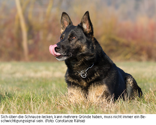 Ein Hund, der im Training mit Leckerchen bestätigt wird und sich über die Schnauze leckt, tut dies jedoch nicht unbedingt als Beschwichtigung. Vielleicht war das Leckerchen einfach lecker und es wird nochmal herzhaft nachgeschmeckt und das Maul gesäubert.