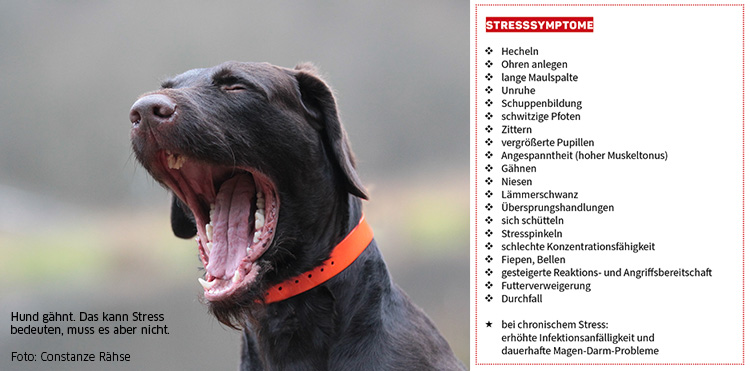 Worüber man sich auch im Klaren sein sollte ist, dass falscher Ehrgeiz und damit verbunden zu hohe Trainingsanforderungen ebenfalls negativen Stress auslösen. Sie führen nicht selten zur geistigen und körperlichen Überforderung des Hundes. Auch Wut und Ärger des Hundeführers über misslungene Übungen lösen durch Stimmungsübertragung negativen Stress aus. In solchen Situationen sollte man lieber das Training abbrechen und in Ruhe überlegen, warum die Übung schief gegangen ist.