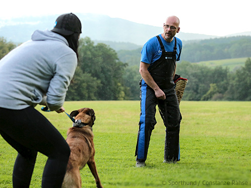 Hans Ebbers: Der Aufbau wäre anders. Der hätte dann nichts mit Belastung zu tun, sondern mit Frustration durch Konkurrenz und Wegnehmen. Zuerst muss ich dem Hund ein technisches Verhalten beibringen, damit er weiß, was er machen soll. Danach kann man etwas Frustration mit ins Spiel bringen, um ein energischeres Verhalten zu bekommen. Das ist ja auch in anderen Bereichen im Ringsport so. Bei der Verteidigung des Hundeführers zum Beispiel. Das ist eine rein technische Übung. Der Hund lernt, dass er in den Vollschutz beißen soll, wenn der Helfer den Hundeführer berührt.